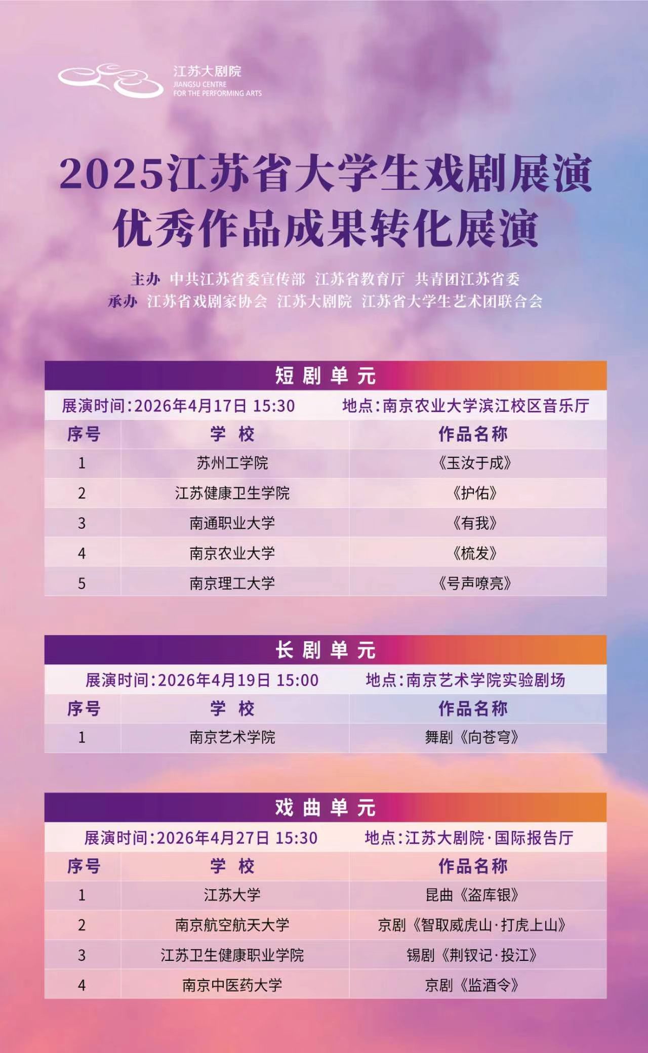 2025年,大学生戏剧展演吸引全省80所高校,133部作品申报,参与规模与作品数量创历届新高,最终49部作品入围终评,斩获长剧类,短剧类,戏曲类三大板块多项荣誉。其中,2025江苏省大学生戏剧展演优秀作品成果转化展演——短剧单元,将于2026年4月17日15:30,在南京农业大学滨江校区音乐厅精彩上演!诚邀全校师生到场观演,共赏青春戏曲风采。
