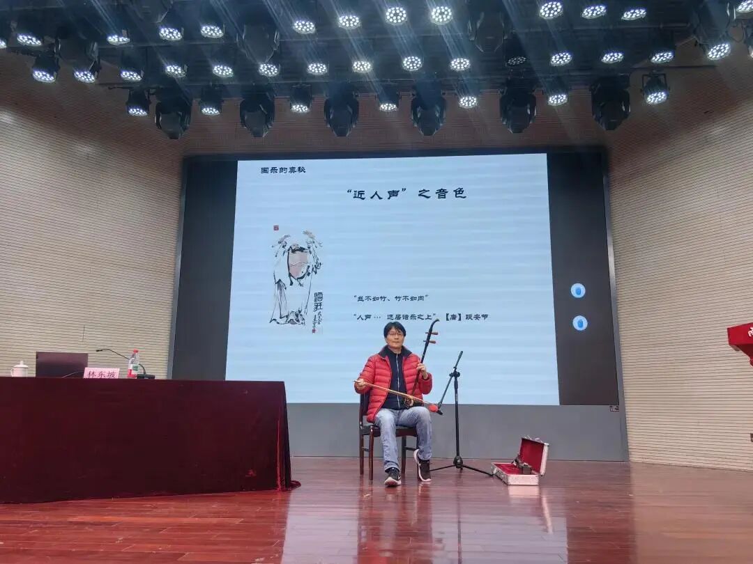 理论阐释之外,林教授还现场演绎《二泉映月》《茉莉花》等经典曲目。弓弦之间,音色如诉,旋律婉转,国乐“近人声”的特质与线性旋律的美感得以生动呈现,让观众不仅听懂理论,更“听见”国乐之美。